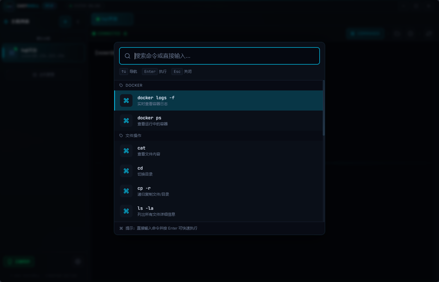 内置常用命令快捷面板,按 Ctrl + K 快速调出,支持 Docker、文件操作等常用命令。