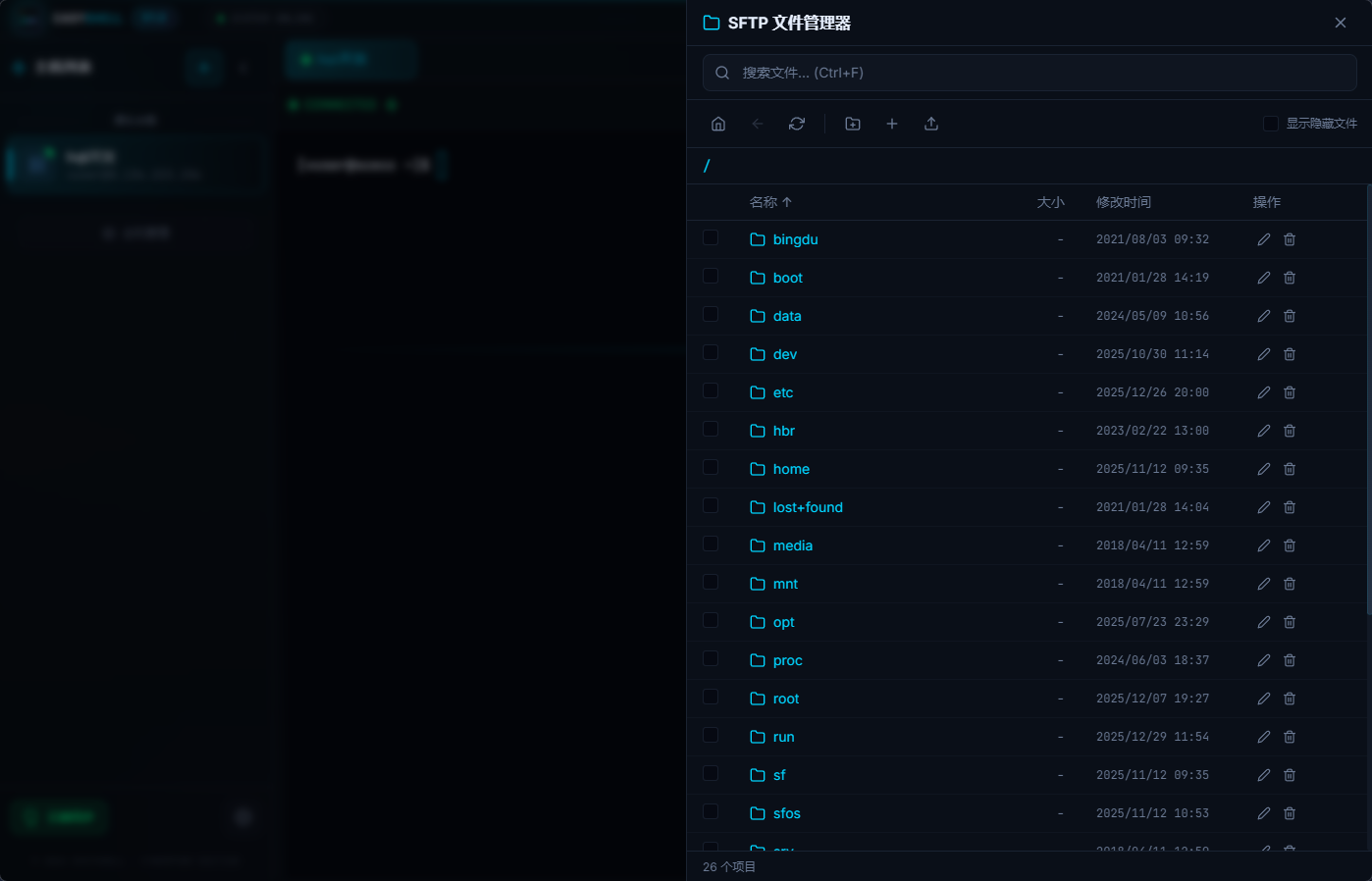 强大的 SFTP 文件管理功能,支持文件浏览、上传、下载、重命名、删除等操作。